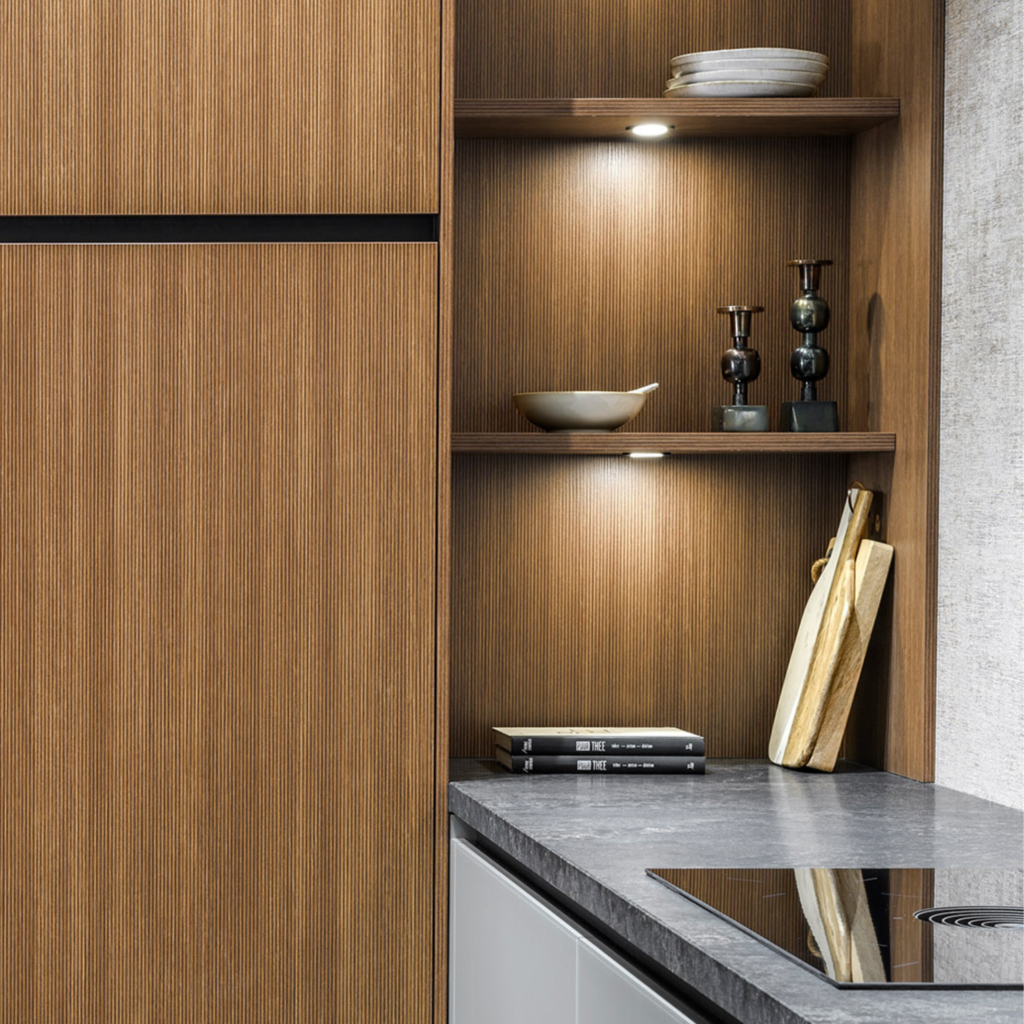 Om extra sfeer te brengen aan deze keuken hebben we gekozen voor een kastenwand in de kleur X-VU Noten gelinieerd. Dit is een notenkleur met een uniek ribbel design. Dit geeft een zeer bijzonder effect. Het creëert namelijk meer diepte in het front. Ook de sfeervolle nis is uitgevoerd in deze notenkleur.