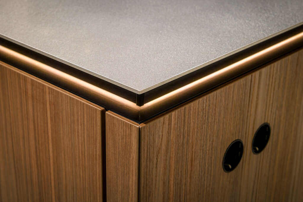 Het werkblad? Een naadloos geslepen orbitaal RVS van slechts 4 mm dik. Industrieel, verfijnd en fluweelachtig in reflectie.