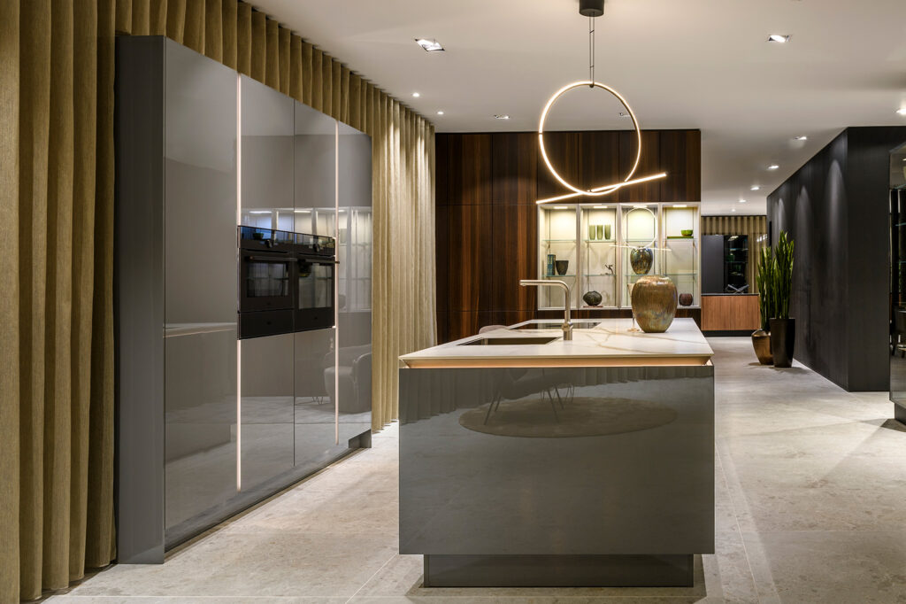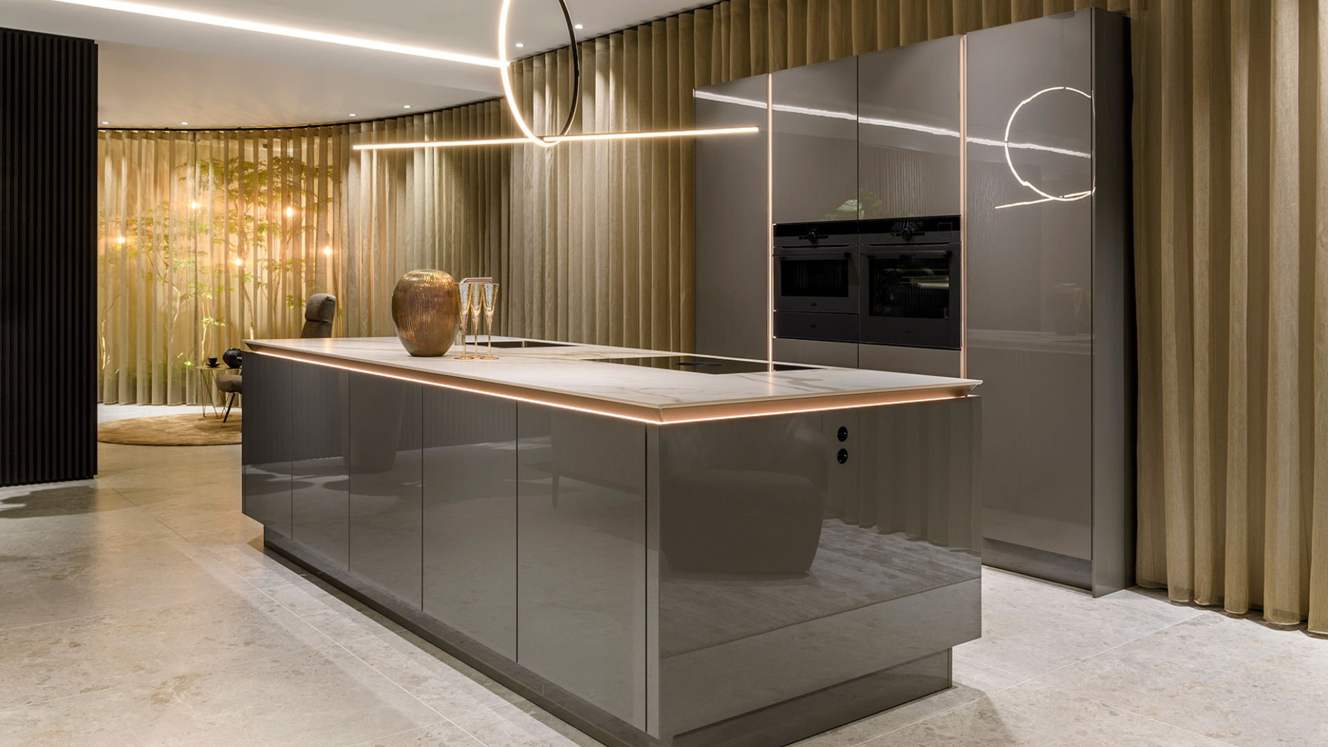 Elegant, greeploos en volledig in balans. Deze SLX-keuken in steengrijs hoogglans straalt verfijning en rust uit. Het werkblad in Borghini satin keramiek vormt met zijn subtiele afschuining een sterke, lichte basis. De SLX-verlichting in de greeplijsten creëert een harmonieus lijnenspel van licht. Een ontwerp dat opgaat in de ruimte, maar toch allesbehalve onopvallend is.