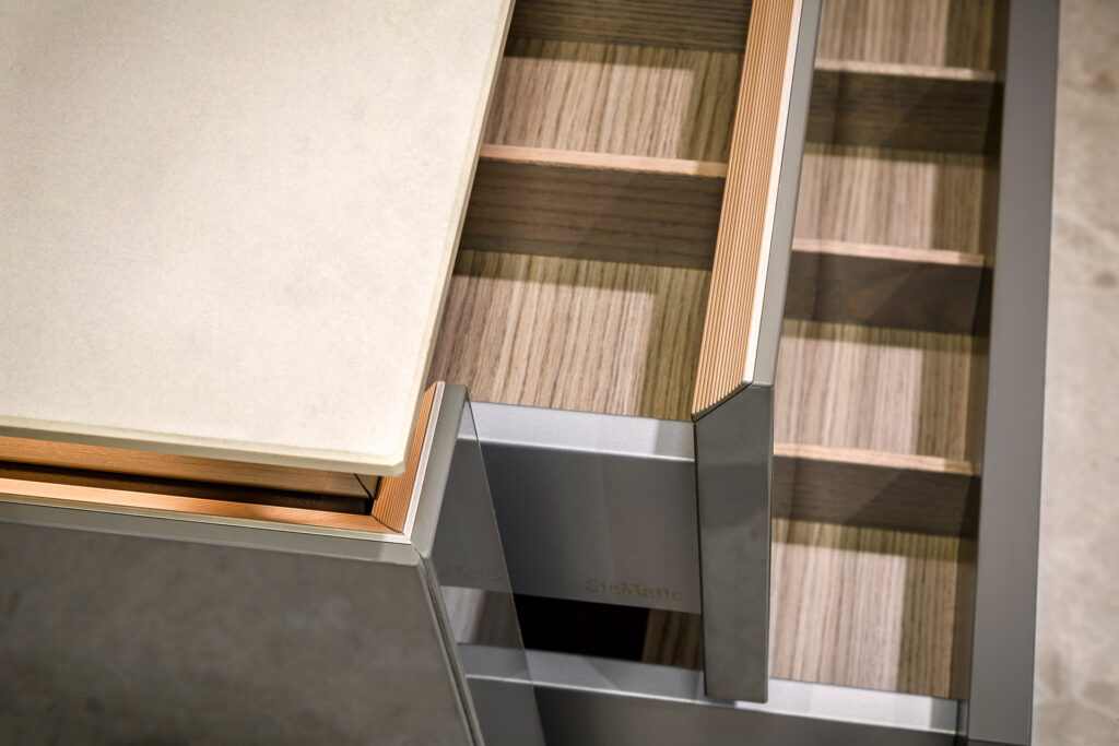 Binnenin vindt u luxe houten bestekindelingen en een uitgekiende lade-indeling. Alles op zijn plek, alles binnen handbereik. Praktisch, geruisloos en stijlvol georganiseerd.