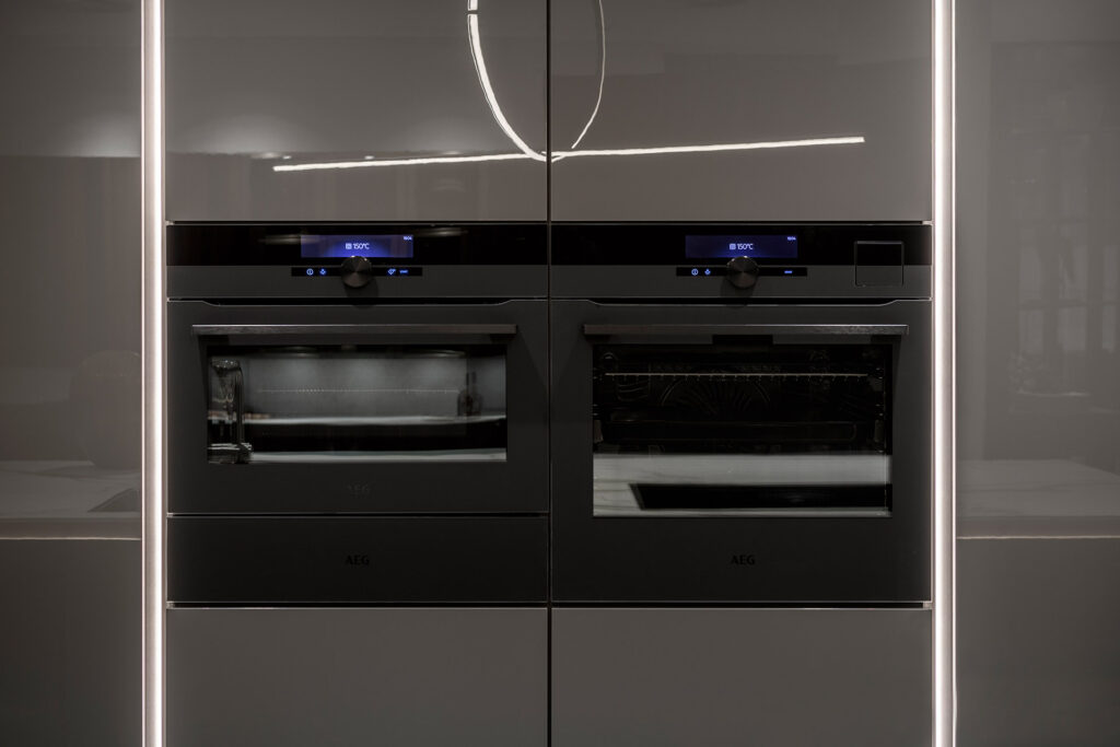 De kastenwand is uitgevoerd met AEG-apparatuur: een stoomoven, combimagnetron warmhoudlade met push-pull functie. Perfect geïntegreerd, met oog voor ritme en rust.