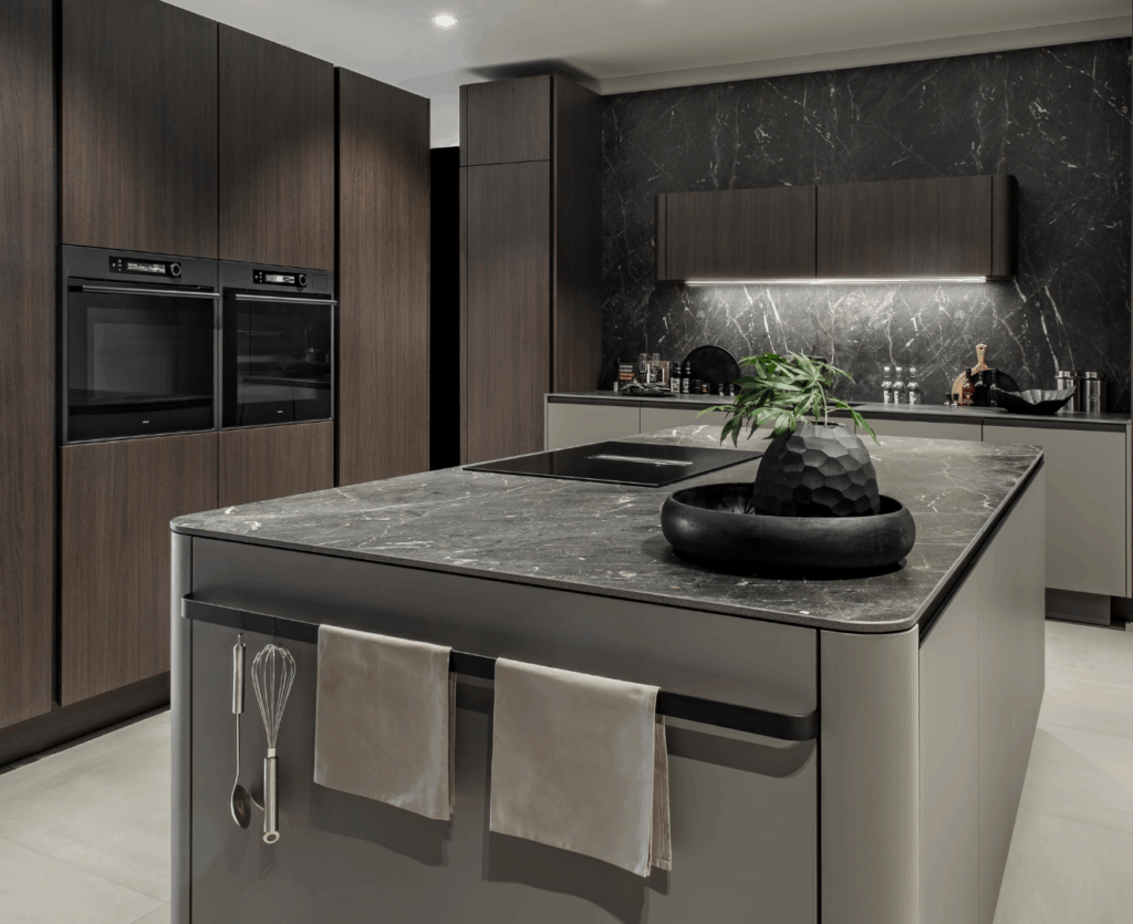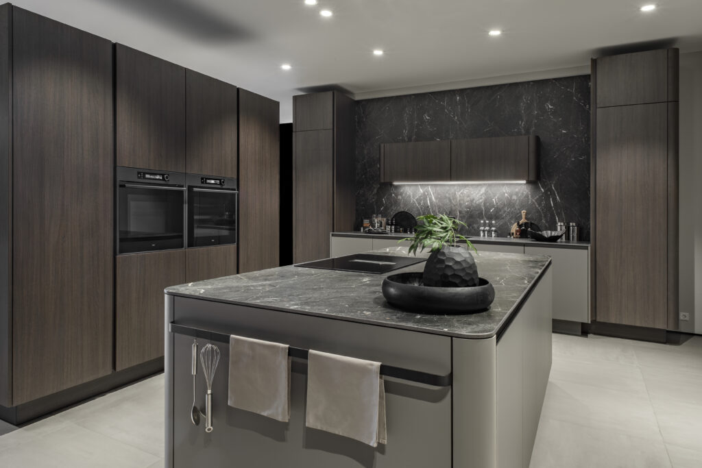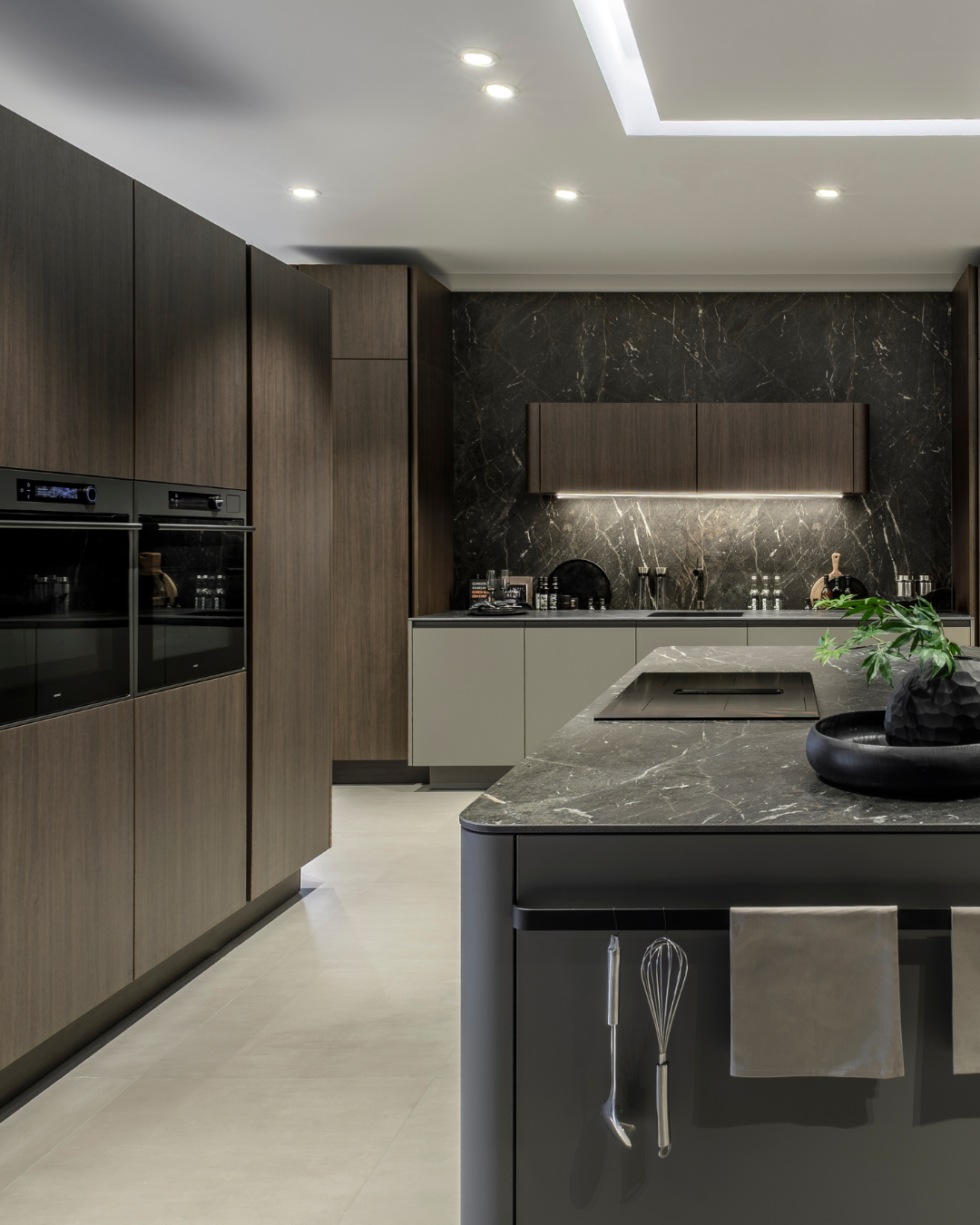 Het eiland heeft afgeronde hoeken en een verfijnde afwerking. Het keramische blad benadrukt de sculpturale vorm. Koken gebeurt op de ATAG inductiekookplaat met geïntegreerde afzuigingen en met de ovens: een oven met magnetronfunctie en een stoomoven.