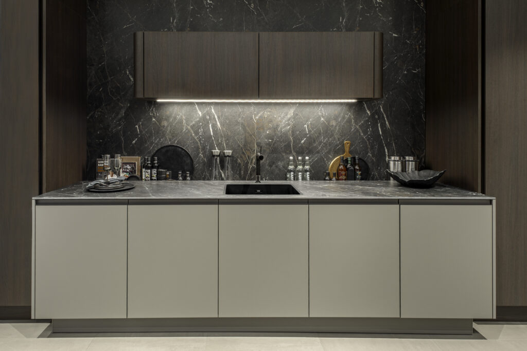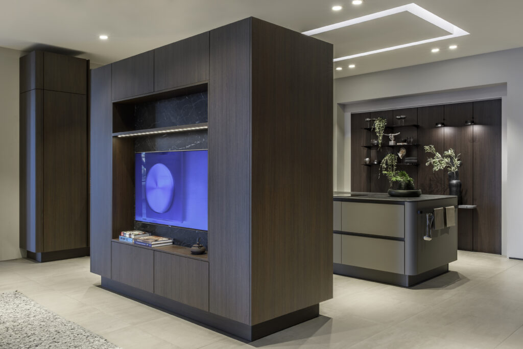 De roomdivider biedt opbergruimte en vormt tegelijk een subtiel meubelstuk in de ruimte. In de kasten vind je doordachte details zoals Multimatic accessoires, kruideninzetten en ophangelementen voor wijnglazen.