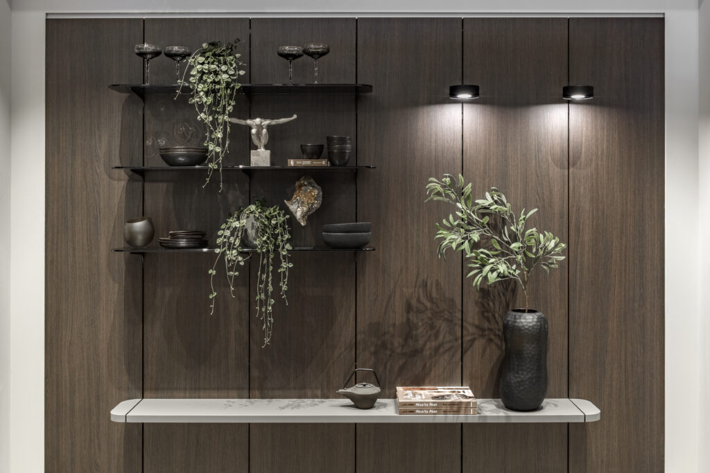 De modulaire panelenwand met subtiele verlichting en zwevende planken geeft de keuken een open en luchtige sfeer. De perfecte plek voor mooie objecten of dagelijkse essentials.