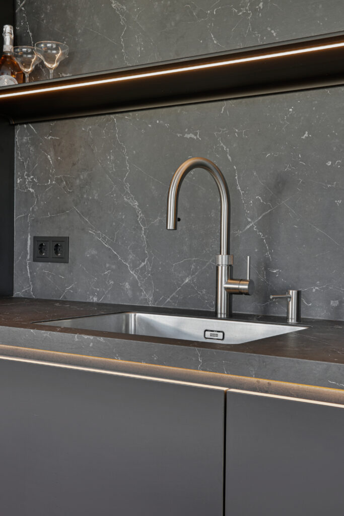Naast alle apparatuur mocht ook een Quooker kraan niet ontbreken in onze keuken. In de showroom zagen we een prachtige keuken met verlichting, dit zorgde ervoor dat wij ook graag verlichting in onze keuken rondom het eiland en de kastenwand wilden.