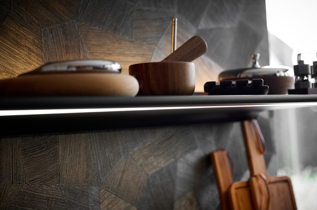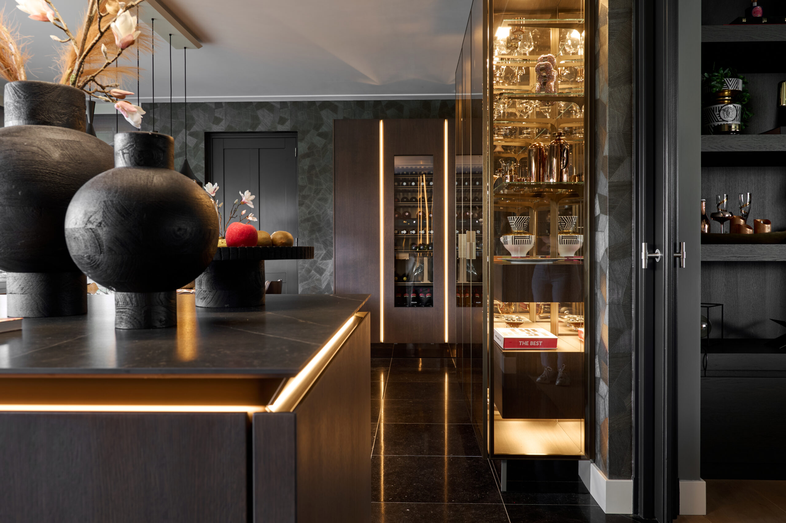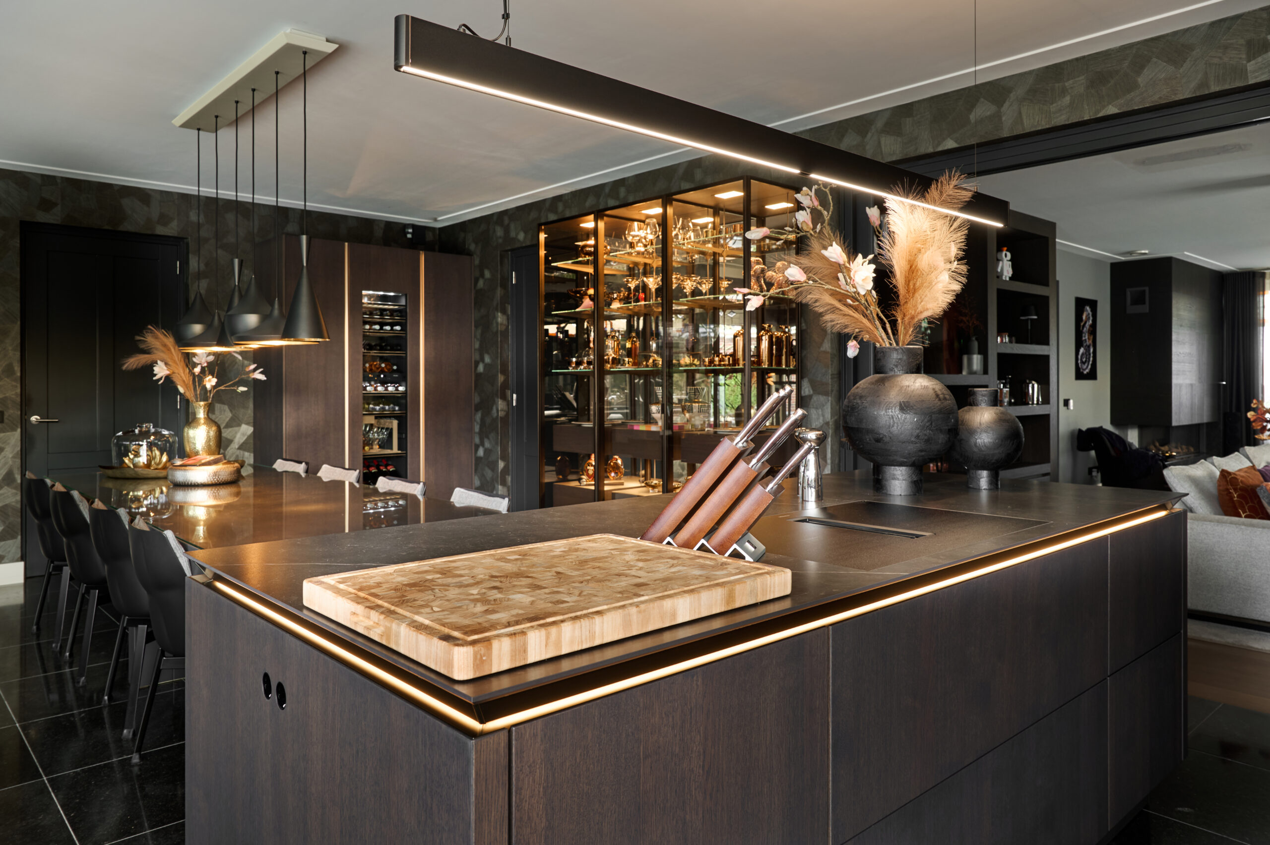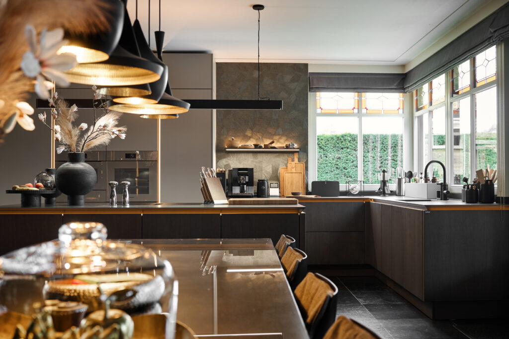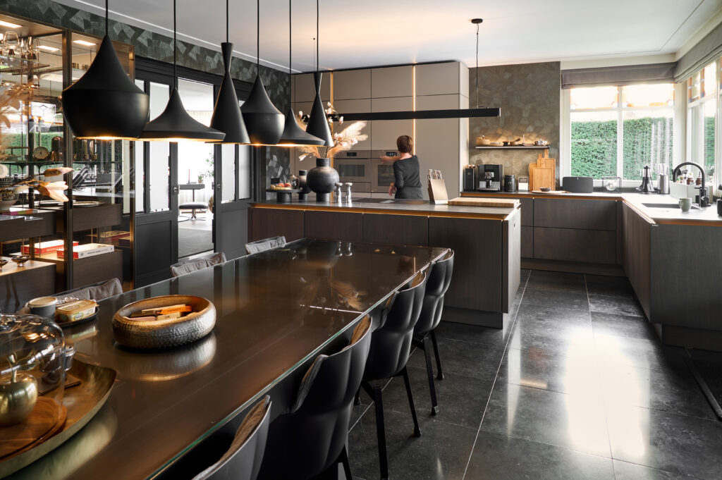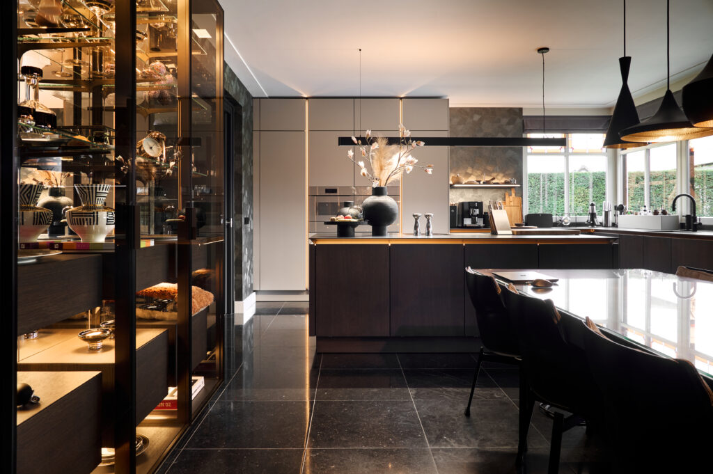 Qua opstelling wisten we al goed wat we wilden. Wat kleur betreft stonden we open voor meer dan we vooraf hadden gedacht, mede door de inspiratie in de showroom. We kozen voor hoogwaardige apparatuur, een eiland en een glazen vitrinekast die gezien mag worden. Een echte show off die het ontwerp karakter geeft.