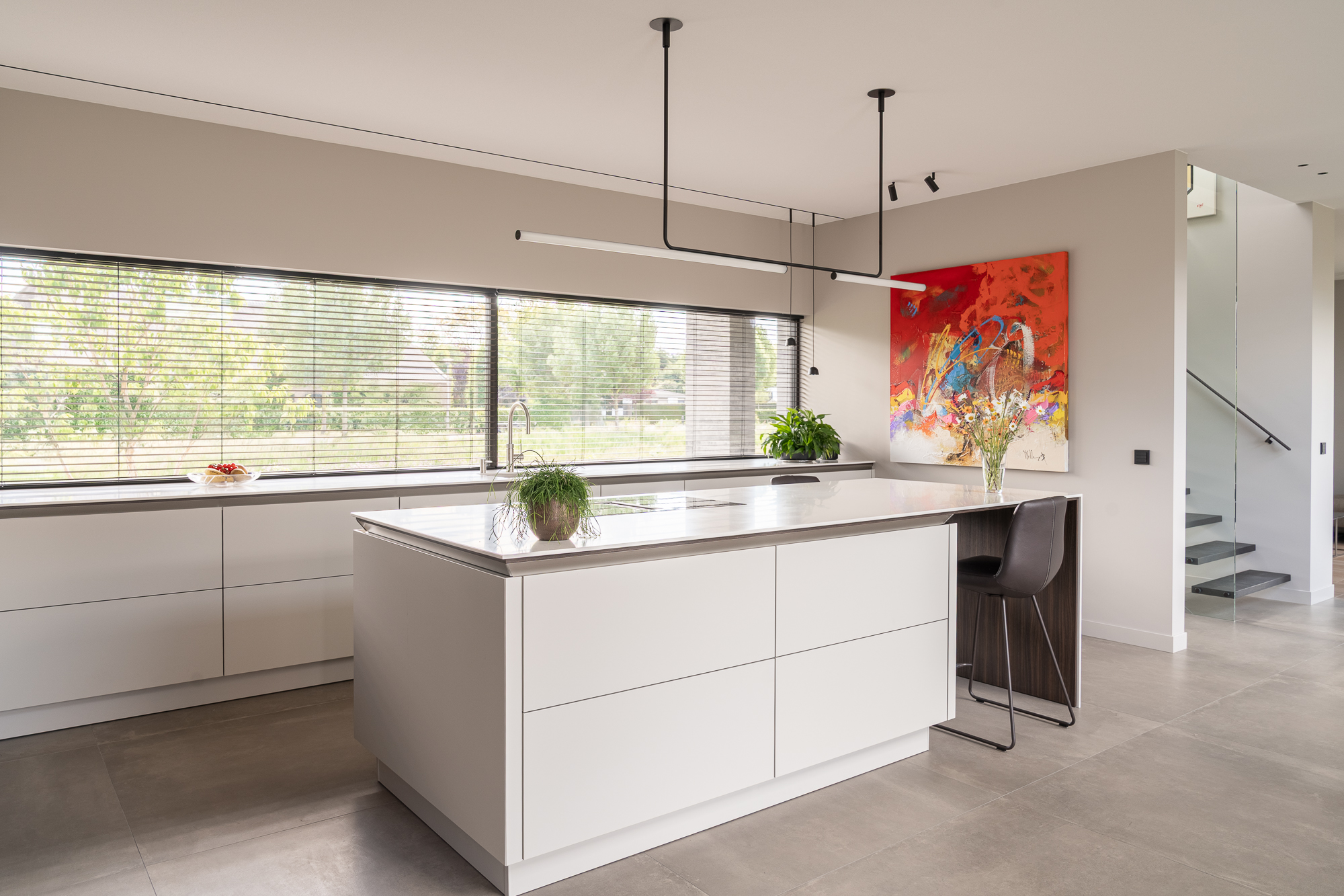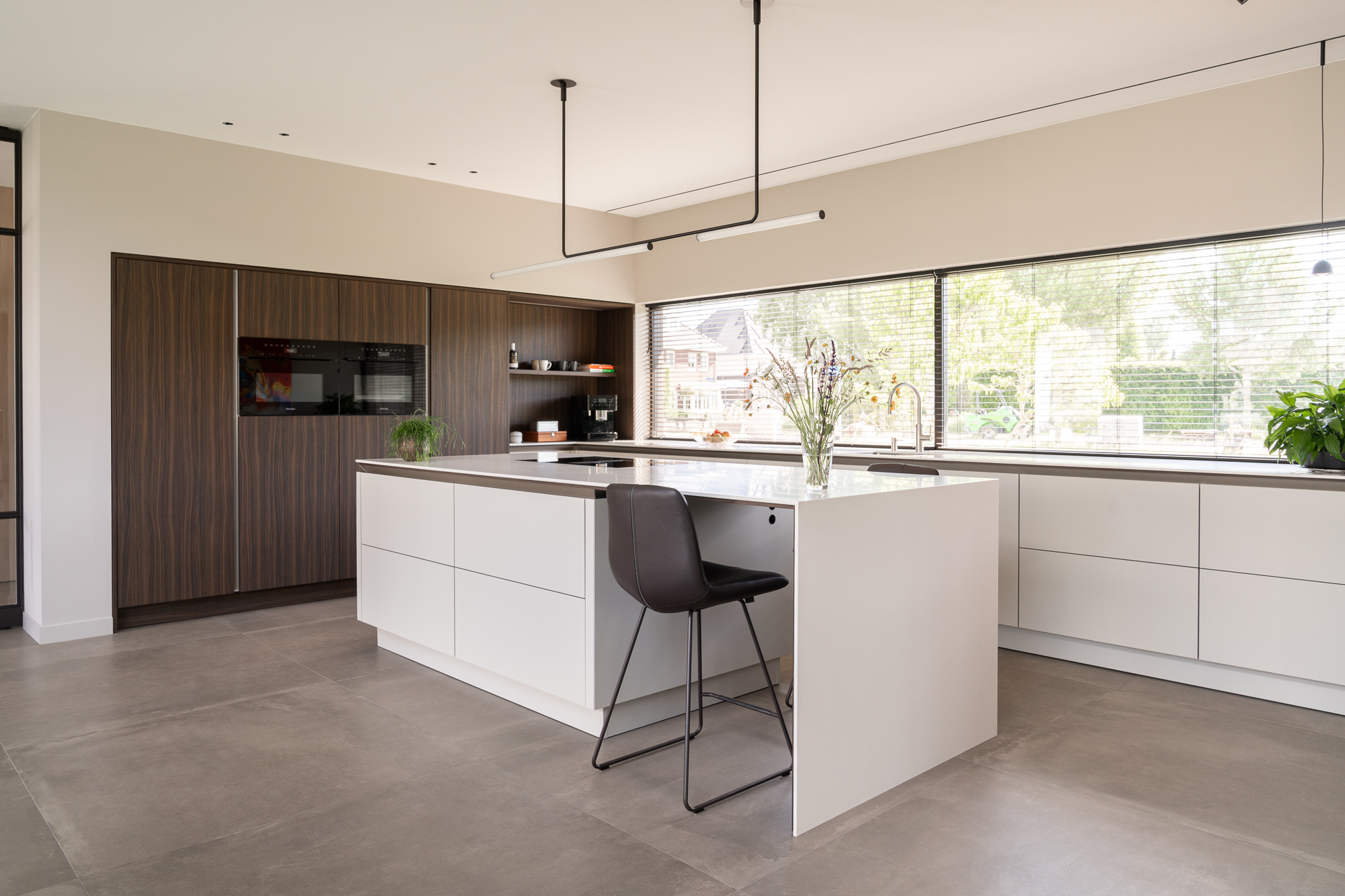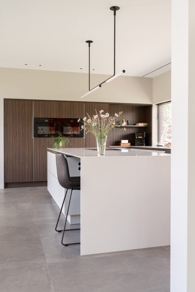 Onze favoriete plek in de keuken? De koffiecorner en het kookeiland. Dat 6 meter lange Corian werkblad zonder naden is echt een blikvanger. Aan de onderzijde is hetzelfde hout gebruikt als voor de hoge kasten, een prachtig detail. We starten elke dag met een ontbijtje aan het kookeiland, uitkijkend op het grote raam. Dat is genieten.