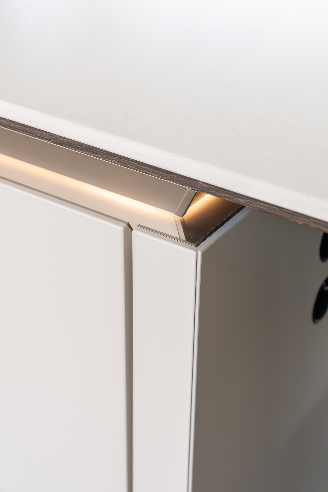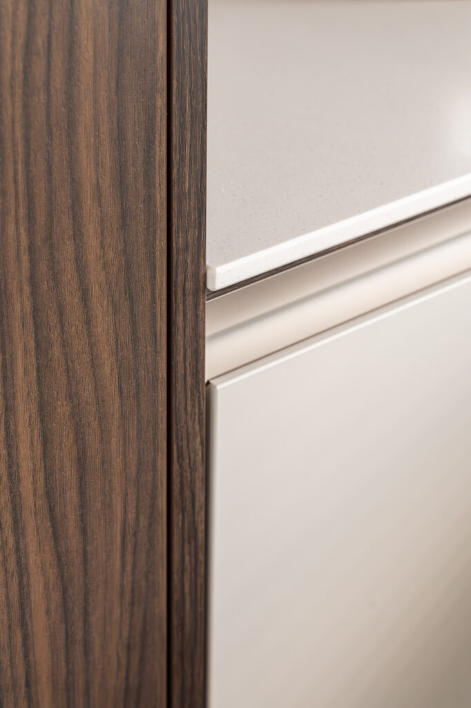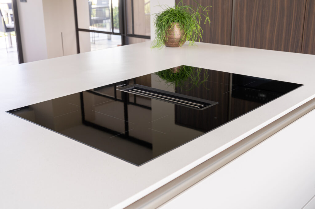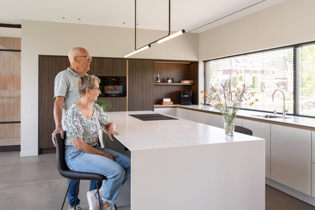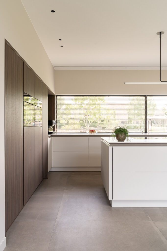 De keuken van familie Wouters is een luxe uitvoering uit de SieMatic SLX-serie. De donkere hoge kasten contrasteren prachtig met het lichte kookeiland en het strakke, symmetrische lijnenspel. De keuken is uitgerust met Miele-apparatuur, een Quooker CUBE en een BORA-kookplaat met afzuiging. Blikvanger is het 6 meter lange, naadloze Corian werkblad in de kleur Crystal Beige met houten afwerking aan de onderzijde.
