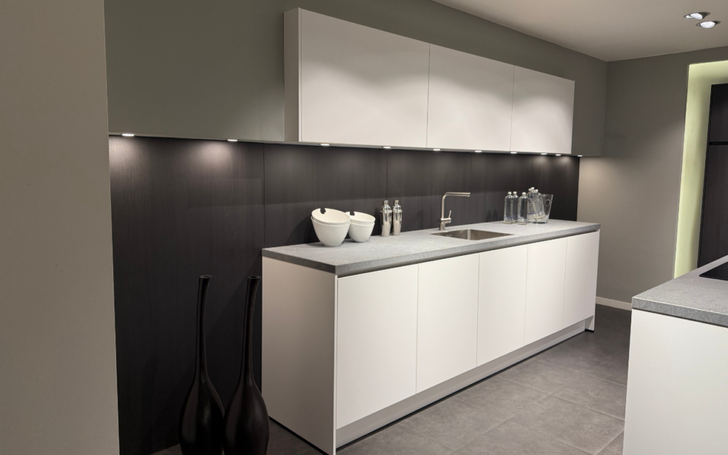 Een combinatie van okobo zwart grijs en kristalwit met een composiet werkblad geeft deze keuken een tijdloze en chique look.