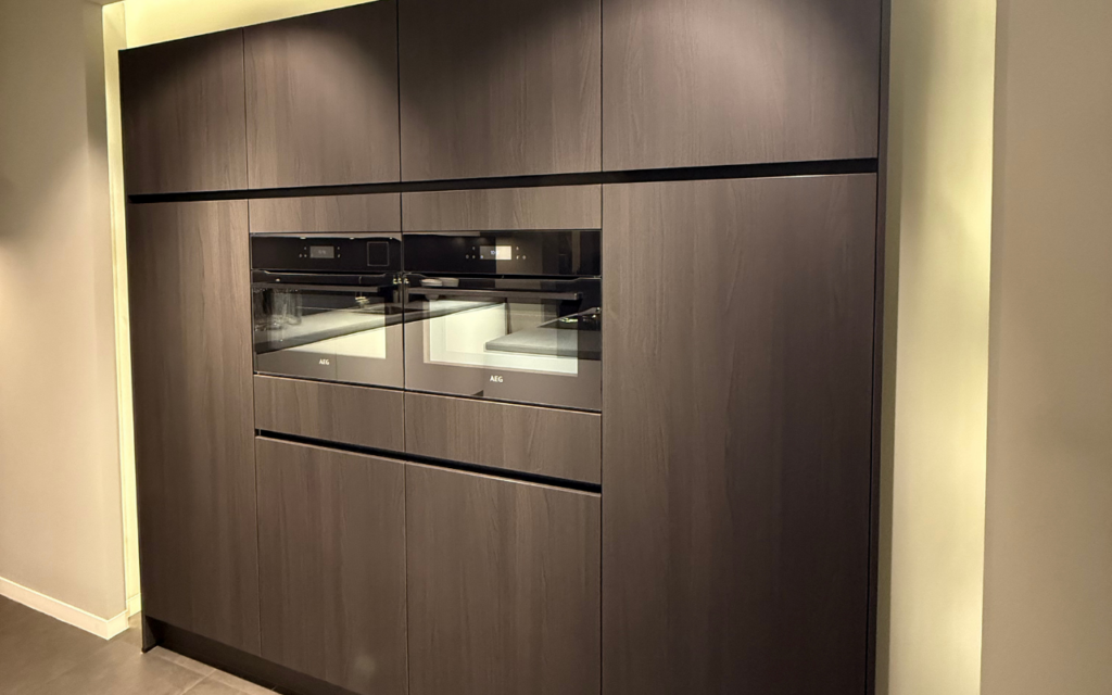 In de hoge kastenwand vind je een multifunctionele oven en combi-stoomoven van AEG. Perfect voor wie houdt van gemak én kwaliteit in de keuken.