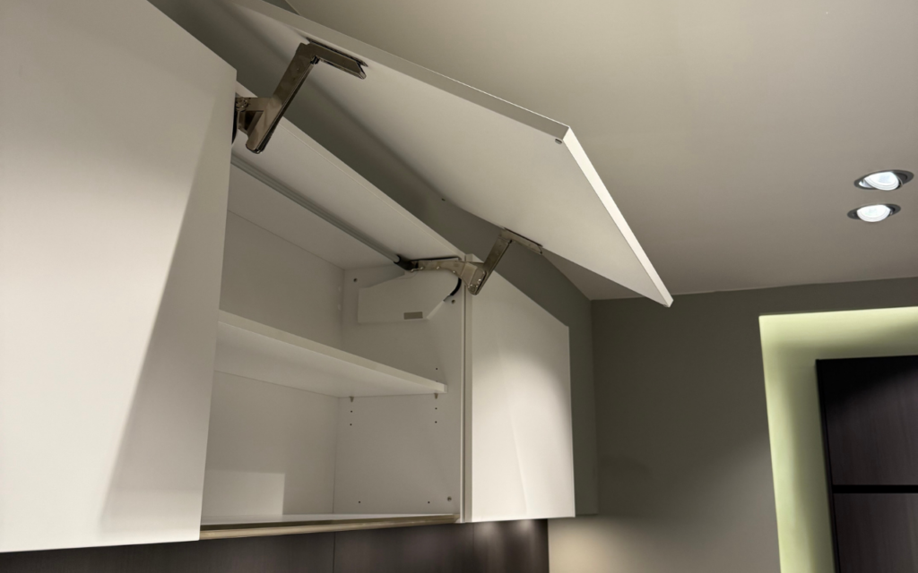 Strakke, greeploze bovenkasten met handige opklapdeuren zorgen voor veel opbergruimte en een moderne uitstraling.
