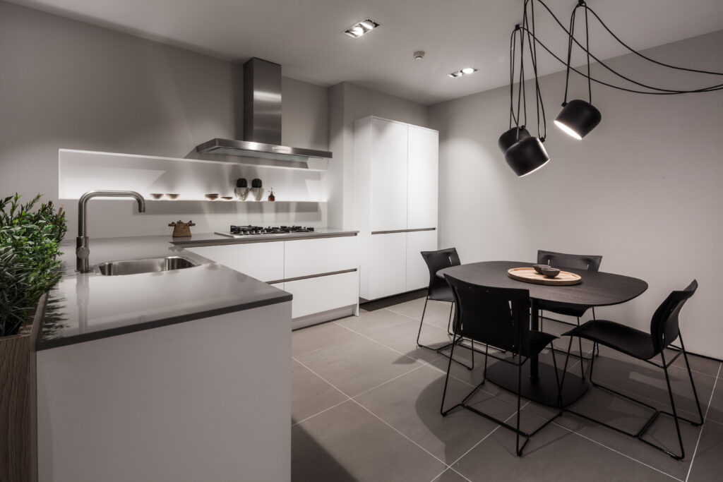 Een moderne en strakke greeploze hoekkeuken, uitgevoerd in de kleur titaanwit.