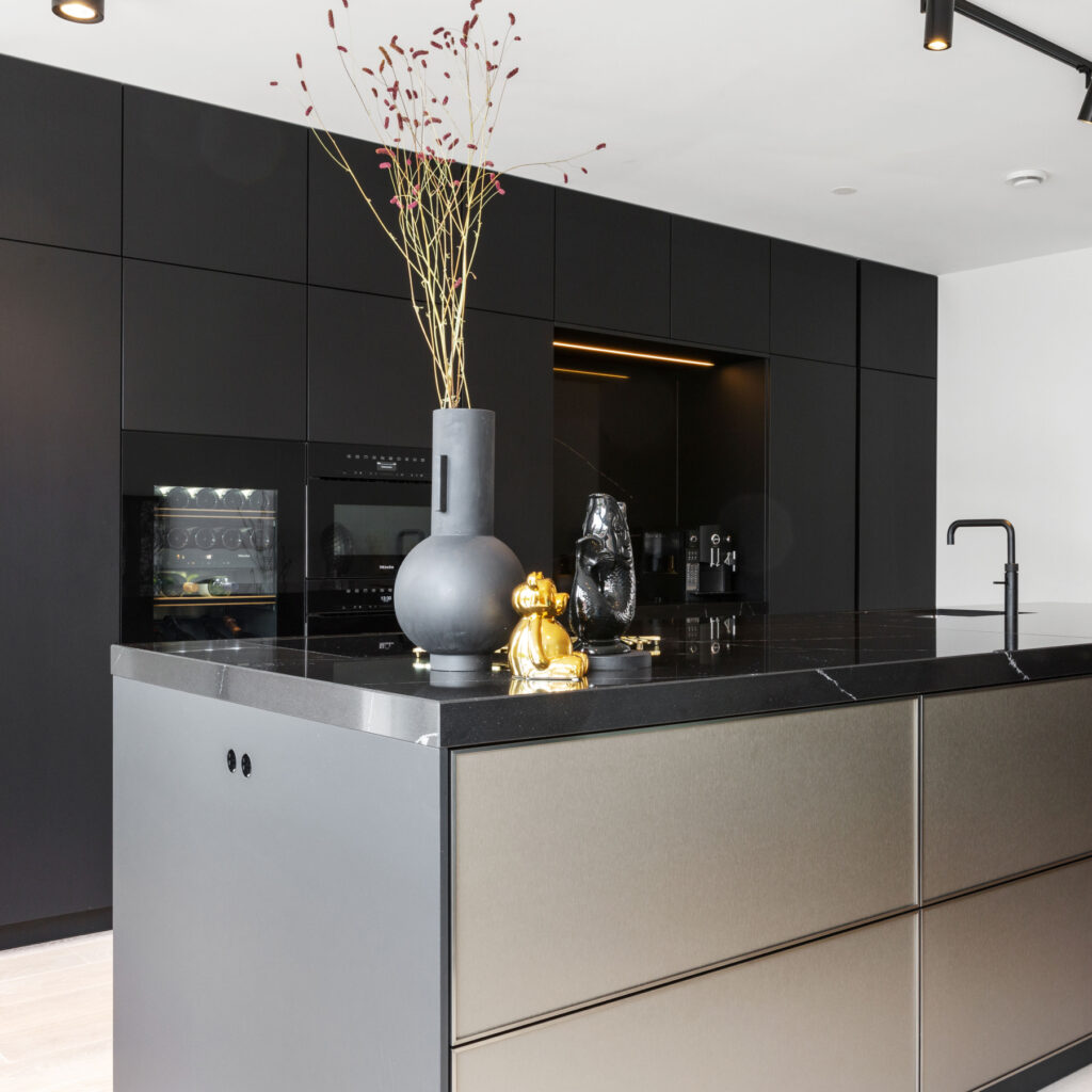 Beschikt u over een grote ruimte voor uw keuken? Dan is een zwart keukeneiland een praktische en sfeervolle keuze. Een zwarte keuken met kookeiland straalt exclusiviteit en luxe uit. Met een zwarte eilandkeuken met bar geniet u van een ruime, luxe keuken waar u heerlijk kunt ontbijten, dineren met vrienden en familie of een gezellig avondje kunt borrelen. Een zwarte keuken met kookeiland is de ideale keuze voor echte keukenliefhebbers. U kunt kiezen voor een zwarte keuken met marmeren blad, wat zorgt voor een elegante en tijdloze look, of voor een keuken zwart mat afwerking voor een subtiele en moderne uitstraling.
